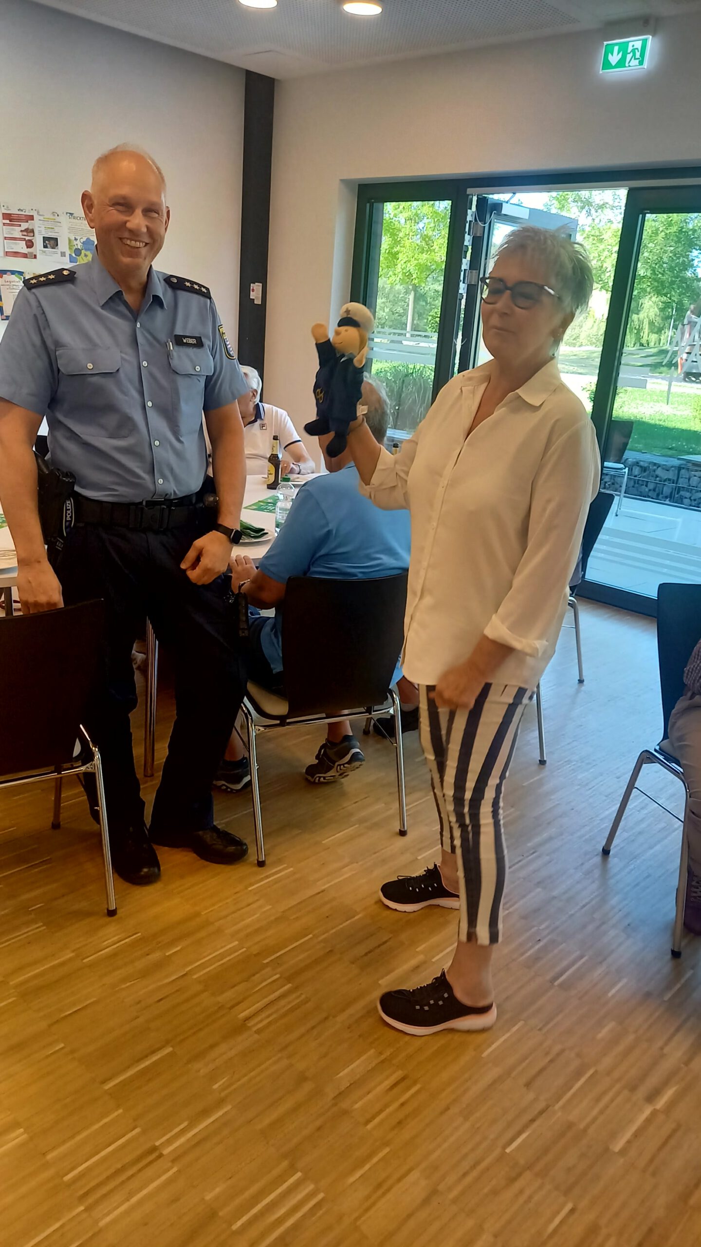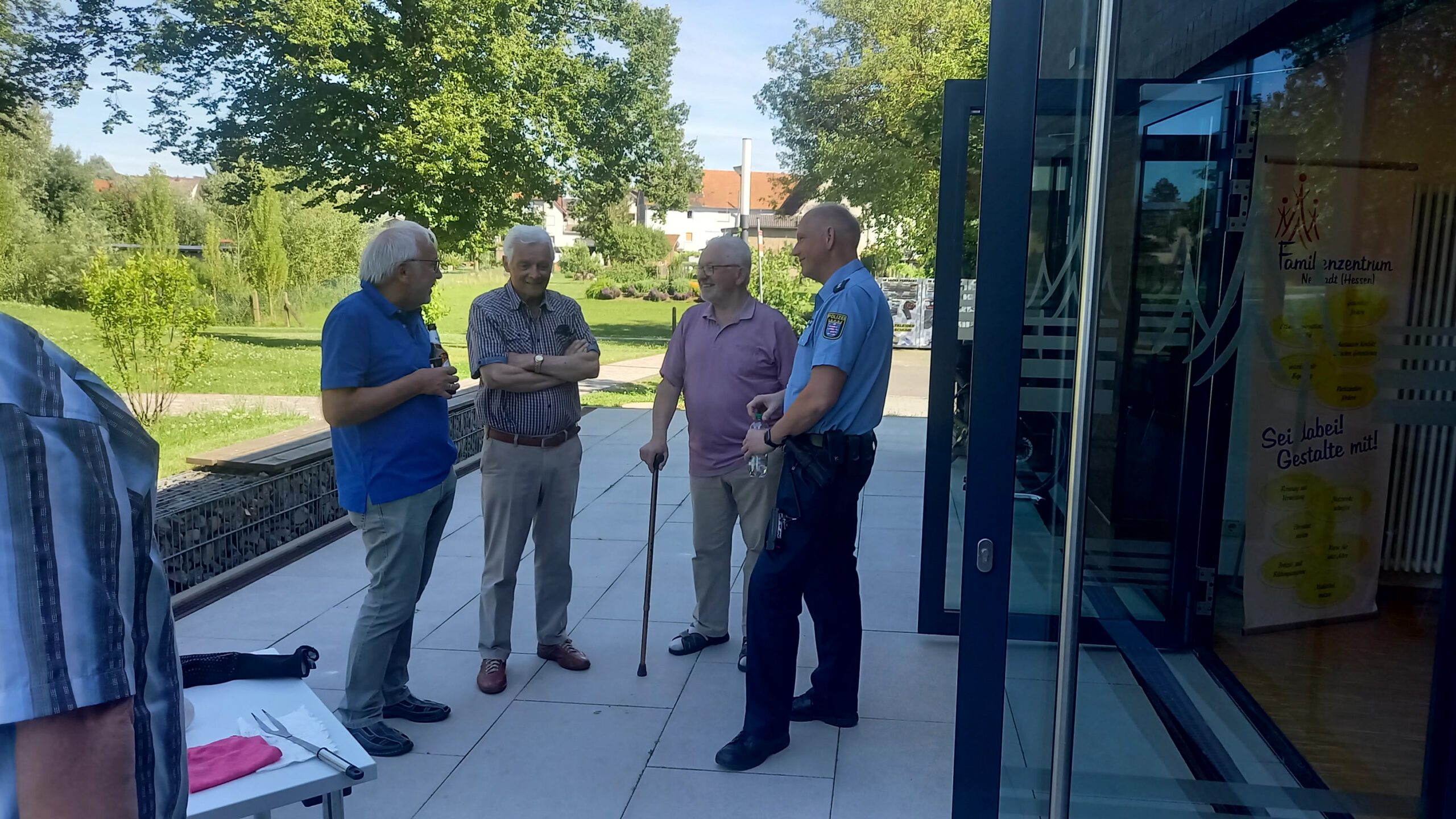 Vergangenen Freitag war es wieder mal Zeit für den monatlichen Männer-Treff. Inzwischen hat sich schon eine schöne Runde zusammengefunden und auch bei den Männern gibt es immer viel zu erzählen und zu lachen. Nachdem wir im letzten Monat schon Besuch von unserem Bürgermeister hatten, war diesmal Gunter Weber, der Schutzmann vor Ort, als Gast mit von der Partie. Herr Weber folgt unseren Einladungen – ob zum Frauen-Frühstück oder jetzt zum Männer-Treff – immer gerne, bietet sich ihm dabei doch immer die ein oder andere Gelegenheit zwanglos mit den Bürgern ins Gespräch zu kommen. Für seine treuen Besuche auf allen unseren Veranstaltungen und auch bei den Tageskindern von Roswitha Trümpert, überreichte sie ihm als Dankeschön eine Polizisten-Handpuppe für seinen Streifenwagen. Sicherlich auch ein toller Eisbrecher im Kontakt mit Kindern. Kulinarisch wurden die Männer dieses Mal mit Köstlichkeiten vom Grill verwöhnt. Dank eines anonymen Spenders konnten sich die Gäste über frisch gegrillte Würstchen und Steaks freuen. Der nächste Männer-Treff findet am 26.7. um 17.00 Uhr im KuBüZ statt. Wir freuen uns auf viele Gäste.